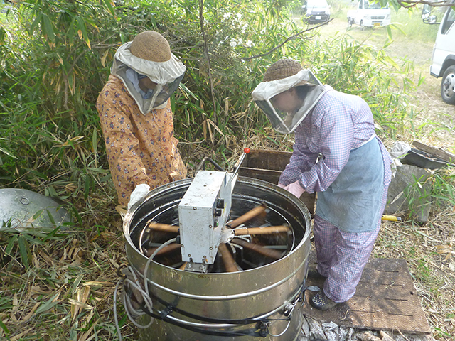 尾瀬のふもとの蜂家さん勢揃い!! 2013年5月28日 Filed under: みつばち達の活動記録 小野 「アカシヤはちみつ」の採蜜場所が当館近くの沼田市まで北上してきたため、今回はなんと一家総出で採蜜してきました。通常は4人での採蜜なので、6人だと採蜜も早い!初代は今年で88歳になりますが、はちみつとローヤルゼリーのおかげか、まだまだ現役で、勉強させてもらうことも多いです。 左から初代、初代妻、二代目、二代目妻、三代目兄、三代目弟、です。撮影三代目兄妻 作業風景1 作業風景2